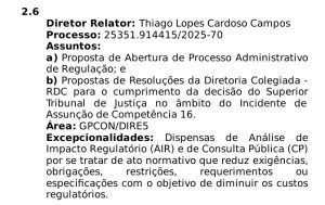 O processo volta à deliberação após pedido de vista do diretor Thiago Lopes Cardoso Campos, apresentado em dezembro de 2025, sob a justificativa da complexidade técnica do tema. A reunião será realizada às 9h30, na sede da Agência, com transmissão pública.