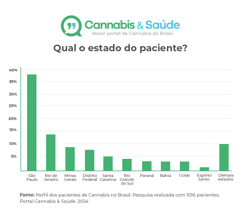- 37,7% das pessoas são oriundas do estado de São Paulo, região do Brasil que mais concentra pacientes de Cannabis medicinal. Seguida pelo estado do Rio de Janeiro, com 14,4%.