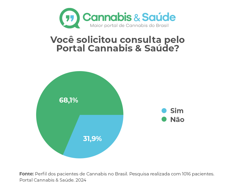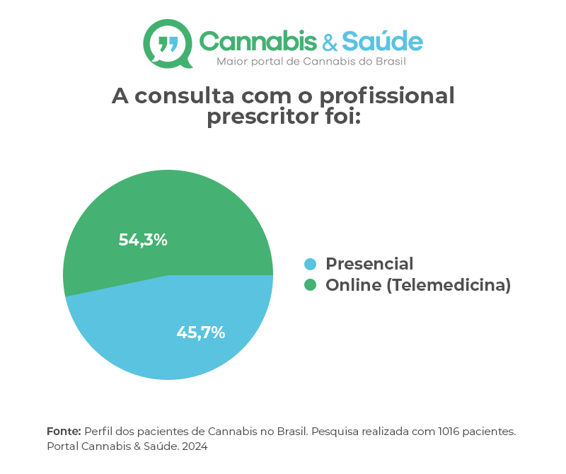 A telemedicina tem desempenhado um papel crucial no acesso a tratamentos com Cannabis. Segundo a pesquisa 54,3% dos pacientes afirmaram que realizaram suas consultas através da telemedicina, enquanto 45,7% concorrem às consultas de maneira virtual.