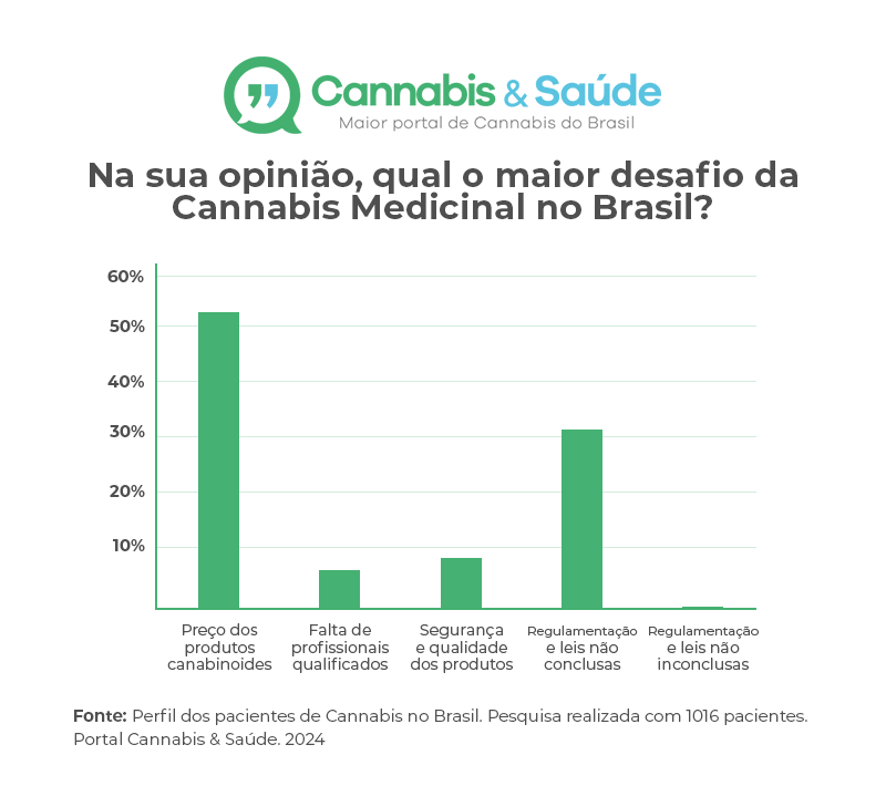 Já em relação aos principais desafios da terapia canabinoide no país, participantes responderam que em primeiro lugar está o preço dos produtos, 53,1%. Em segundo, a regulamentação e leis não conclusas, 31,6%. E em terceiro, a segurança e qualidade dos produtos, 8,9%.
