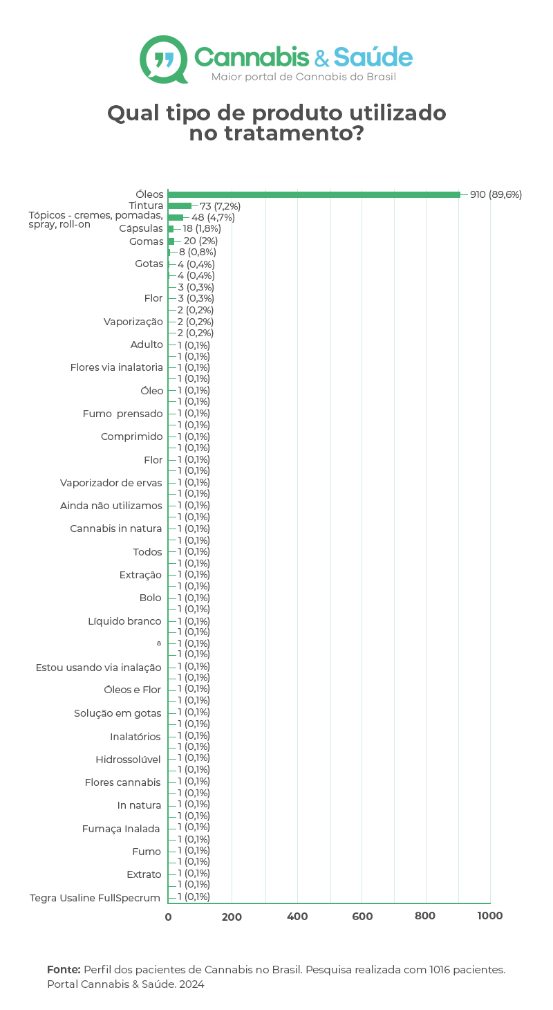Ao todo, 89% dos entrevistados utilizam óleos à base de Cannabis como principal tipo de produto em seus tratamentos. Uso tópico ocupa segundo lugar.