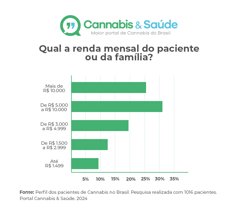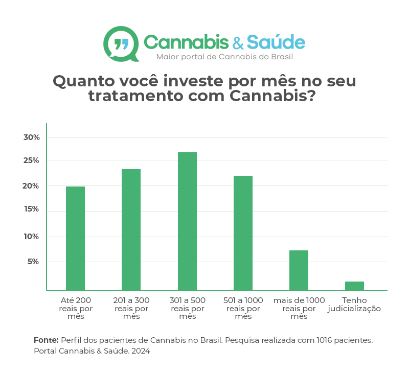 Em relação ao investimento no tratamento, a pesquisa revelou que 26% dos pacientes gastam entre R$ 300 e R$ 500 mensalmente nos produtos à base de Cannabis, 23% gastam entre R$ 200 a R$ 300 e 19% até R$ 200.