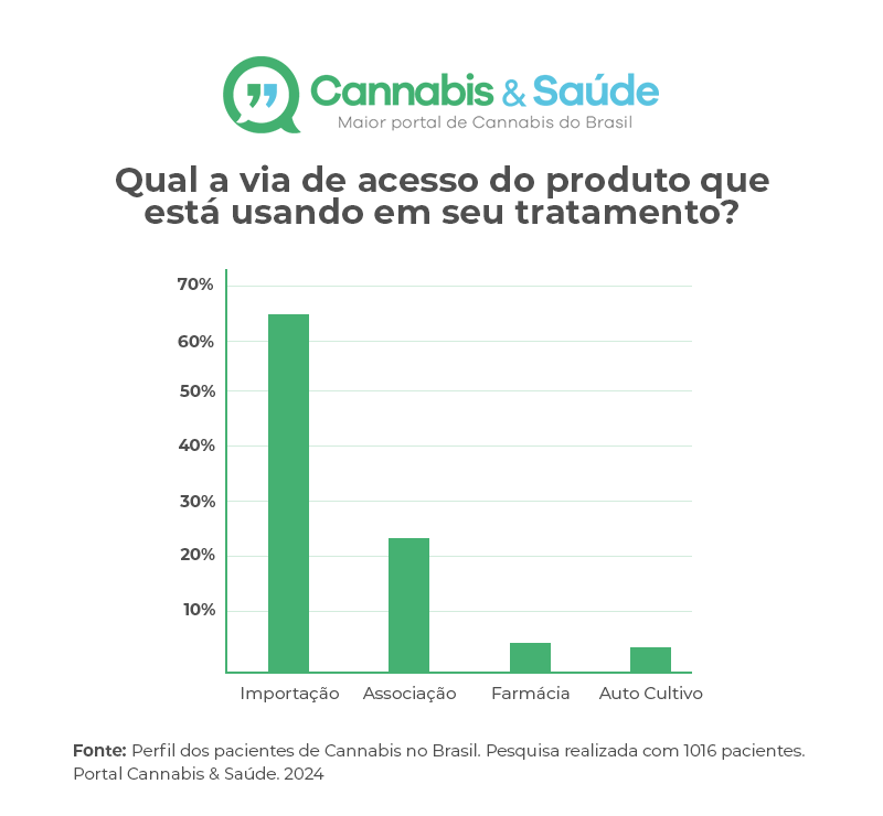 No total, 65,6% dos participantes responderam que a via de acesso dos seus produtos se dá através da importação, via RDC 660 da Anvisa. Já 23,9% adquirem seus produtos via associação, 5,5% via farmácias e 4,9% autocultivo.