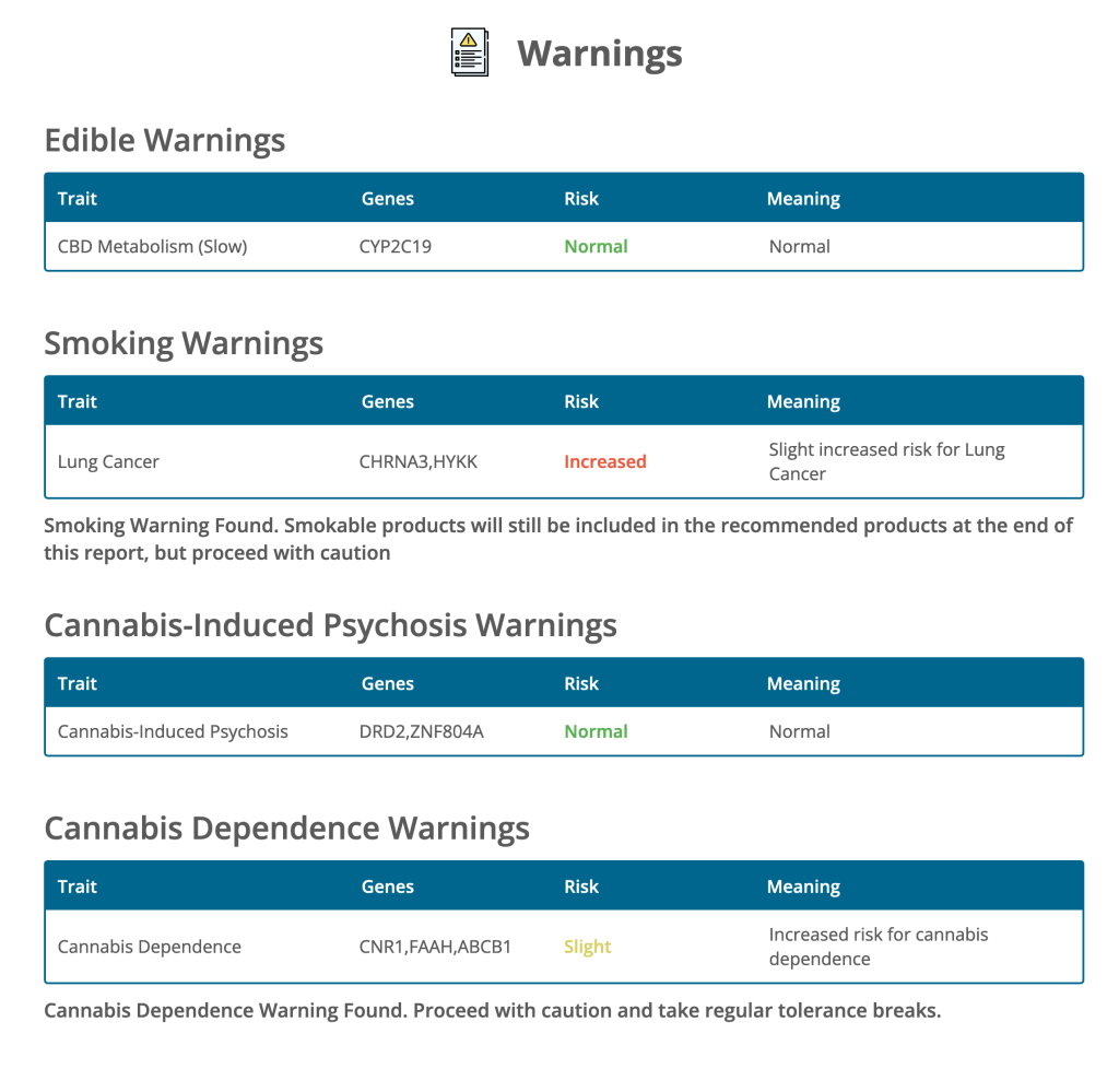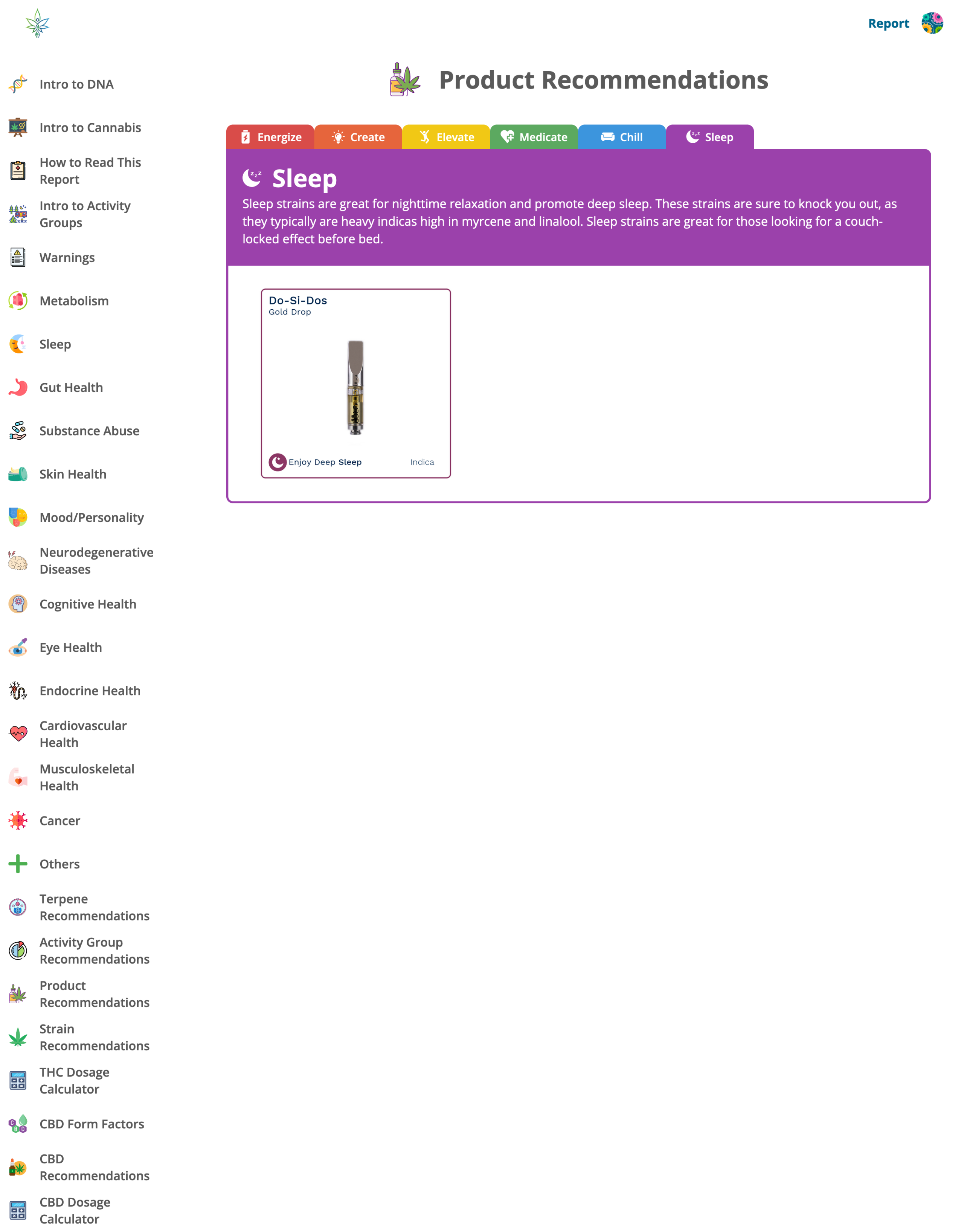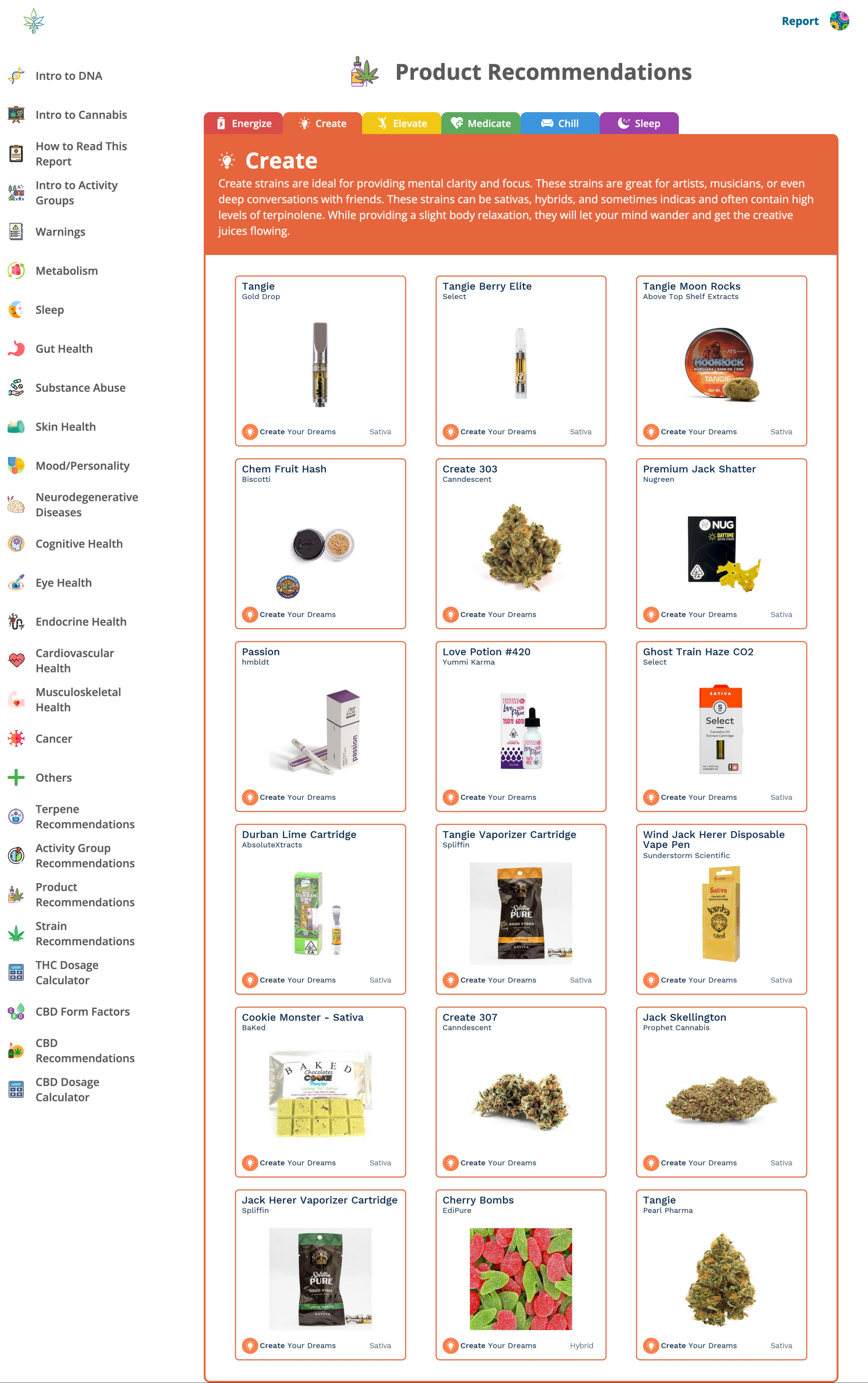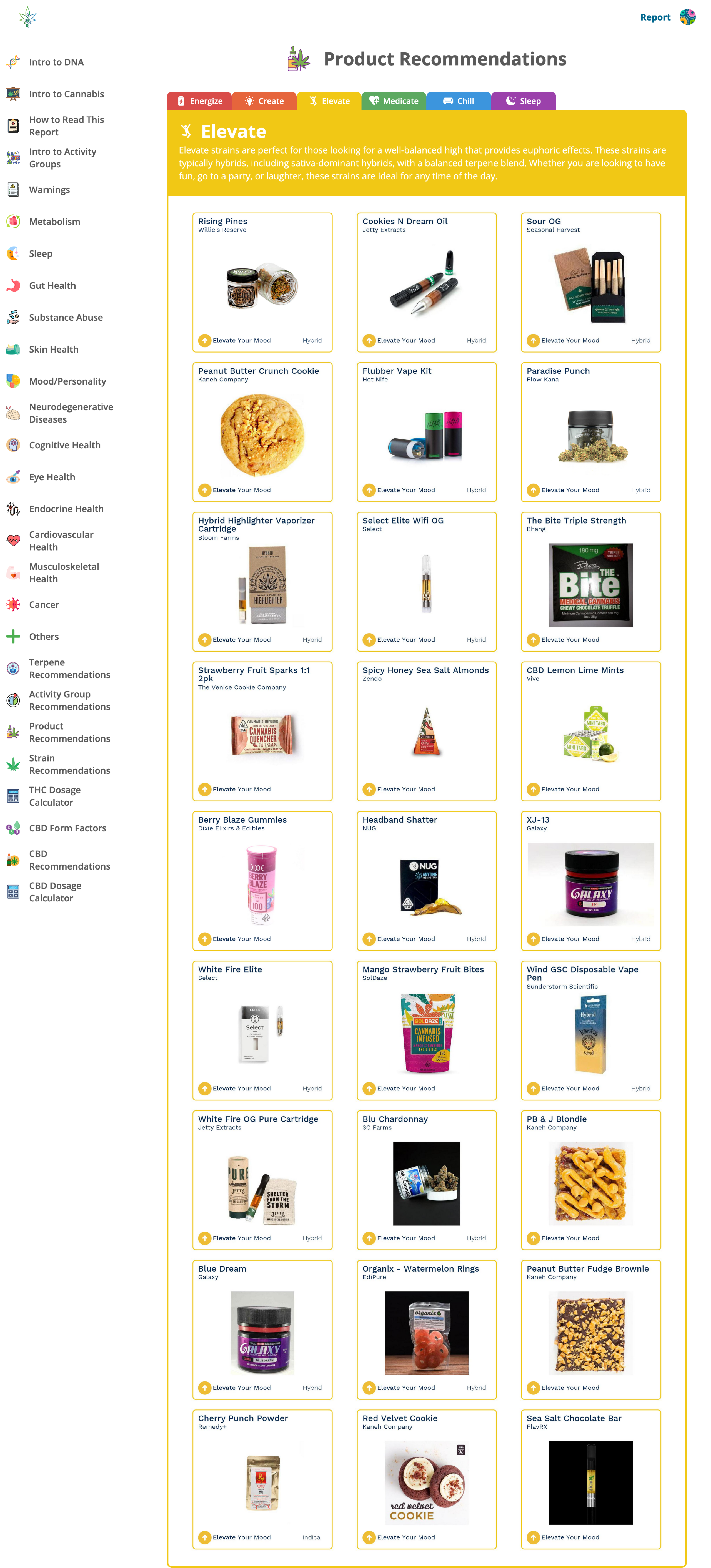 Resultados do teste de DNA e recomendação de produtos com Cannabis