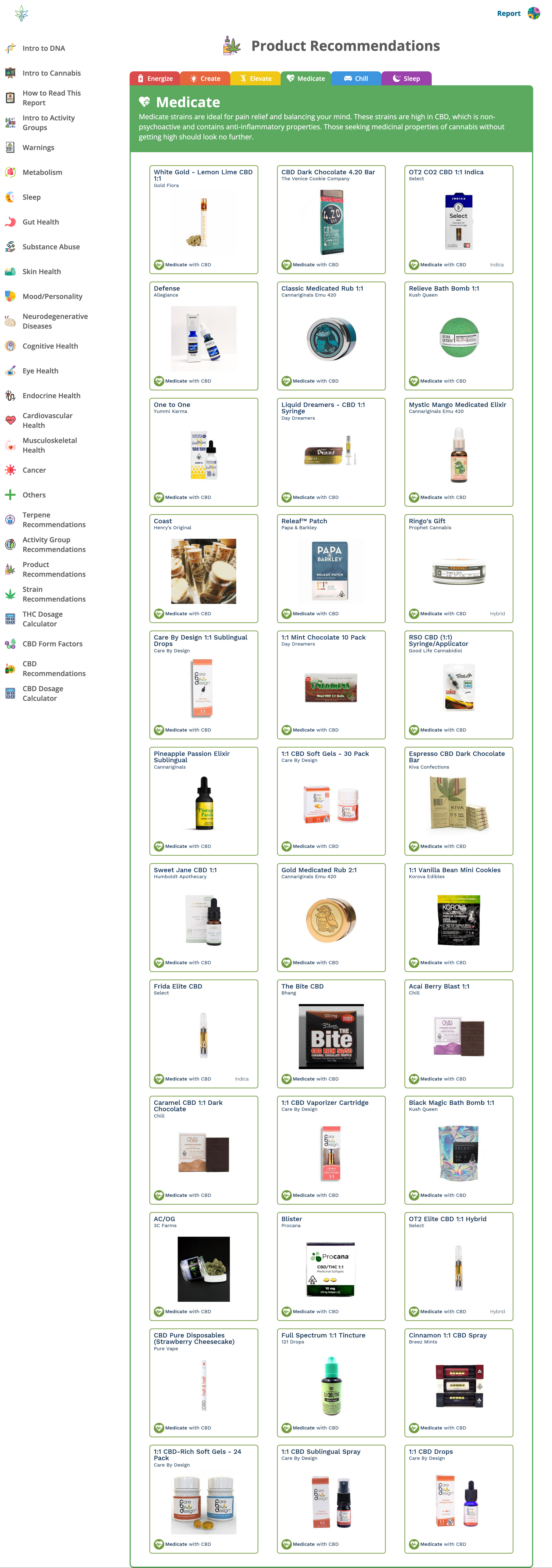 Na galeria abaixo, você pode ver todas as recomendações que o teste de DNA fez, após analisar o sistema endocanabinoide do nosso paciente exemplo.