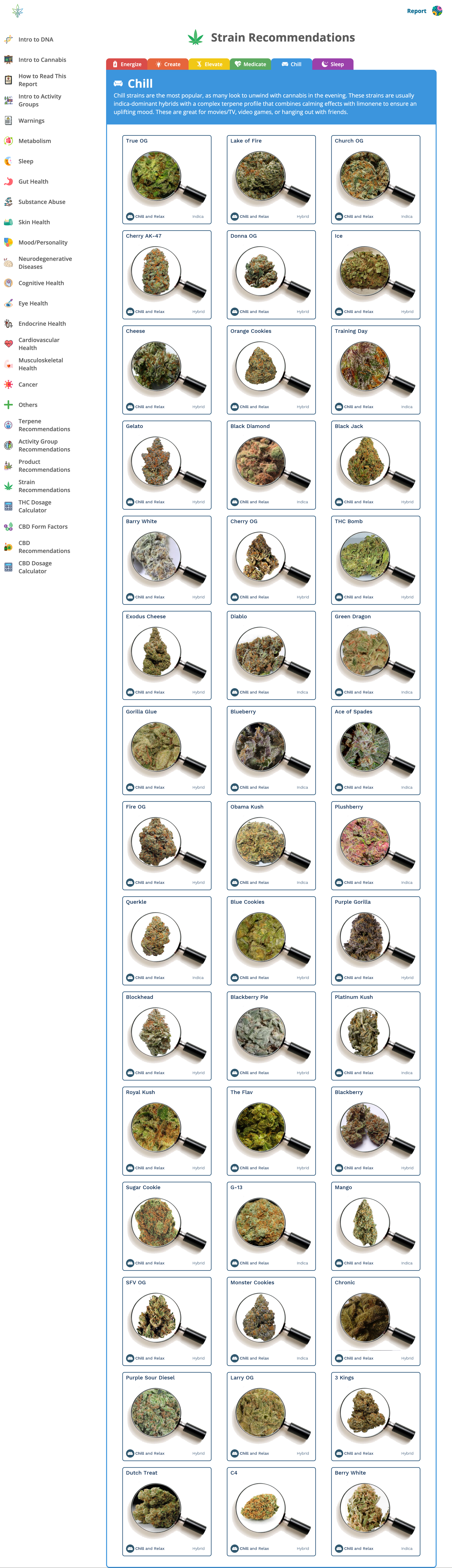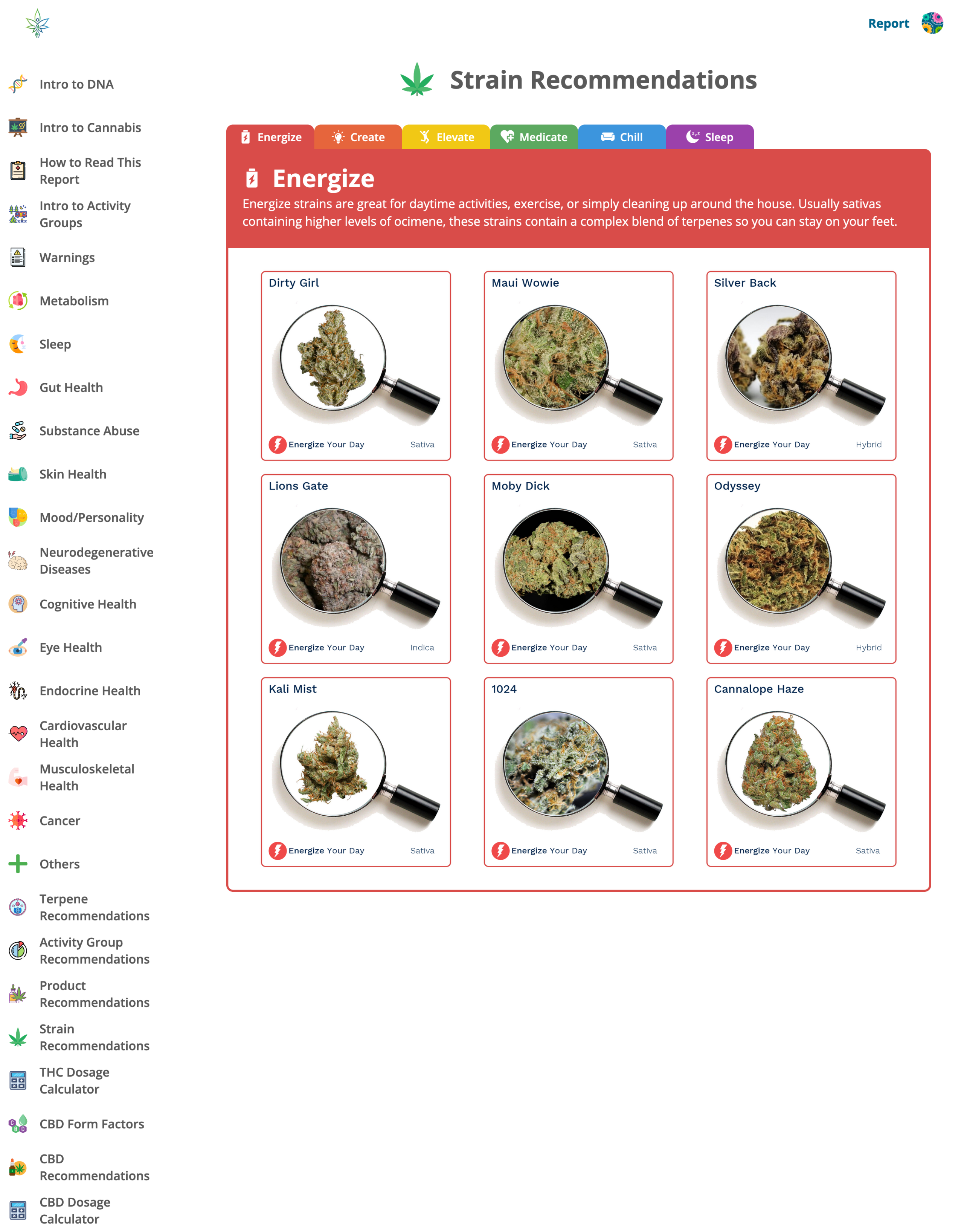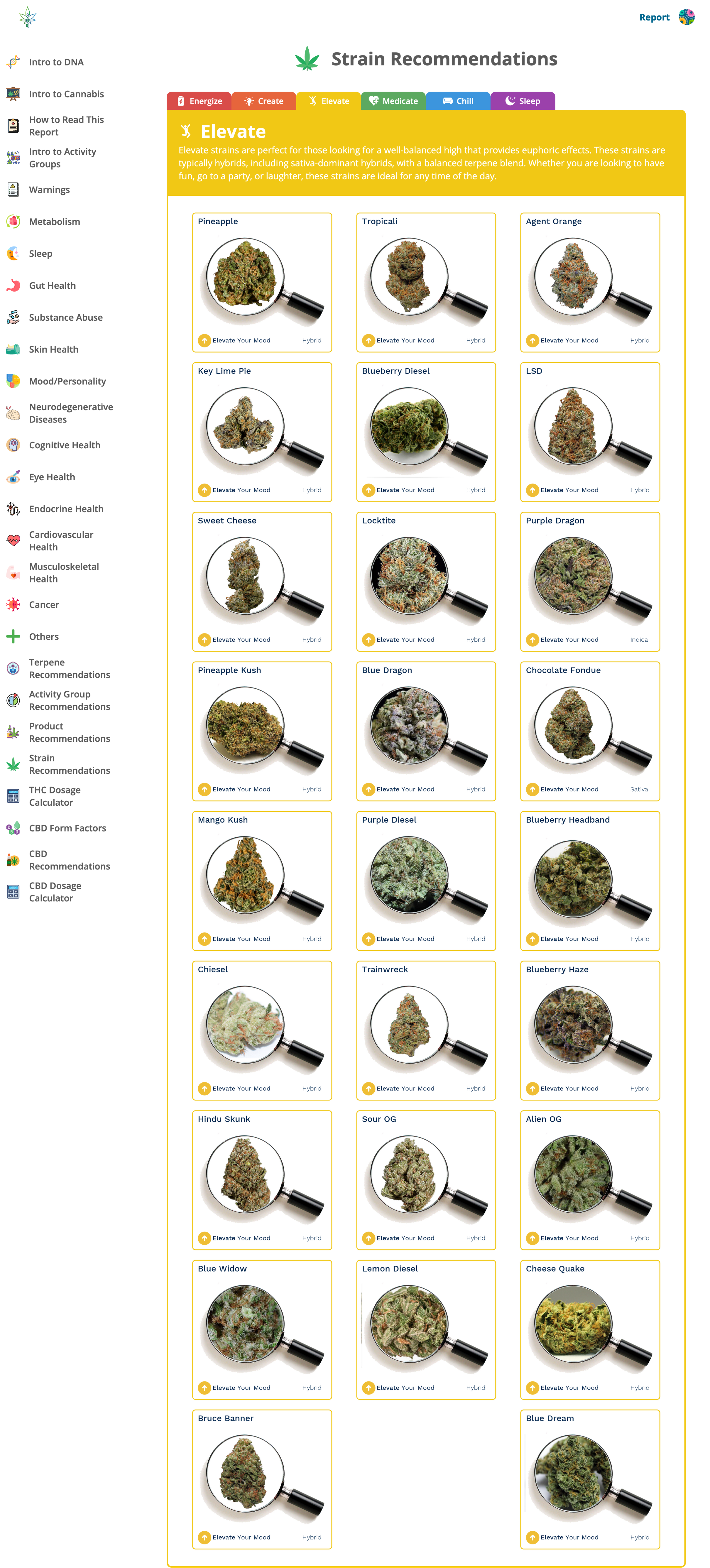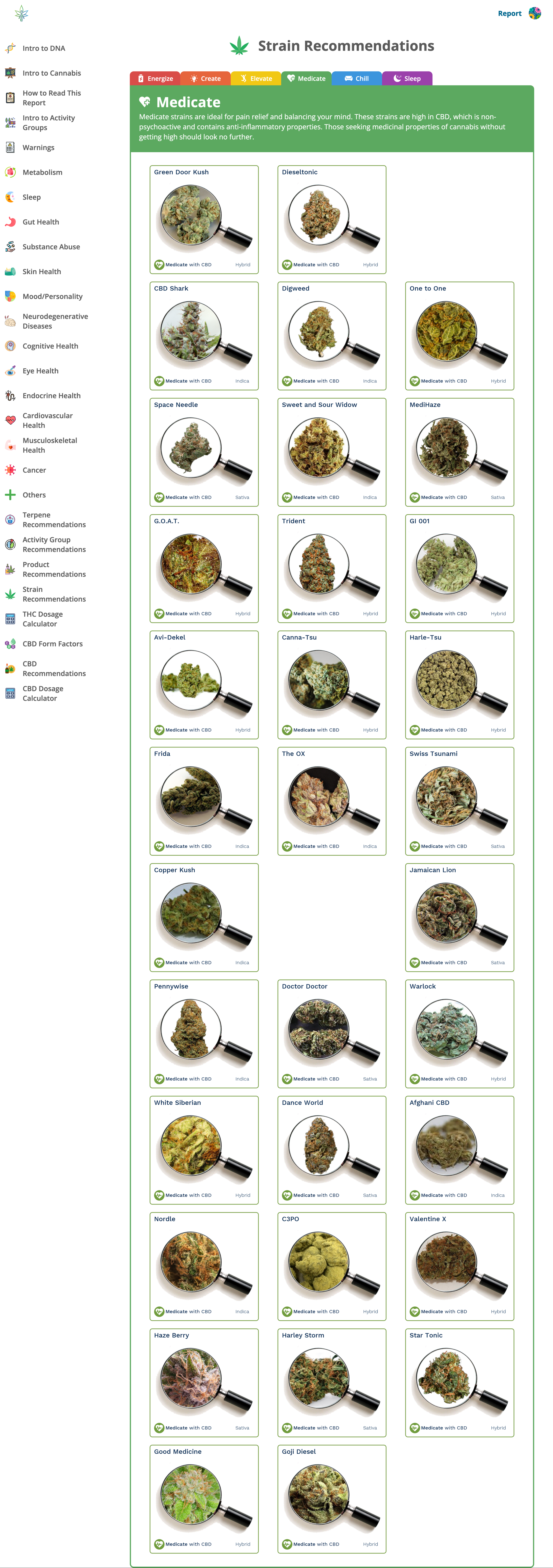 Como mencionamos anteriormente, tivemos acesso a um teste de DNA, que gera um relatório detalhado sobre saúde e sistema endocanabinoide, o Strain Gene. Você vai ver abaixo os resultados do teste de um paciente e todas as recomendações que ele ou ela recebeu.