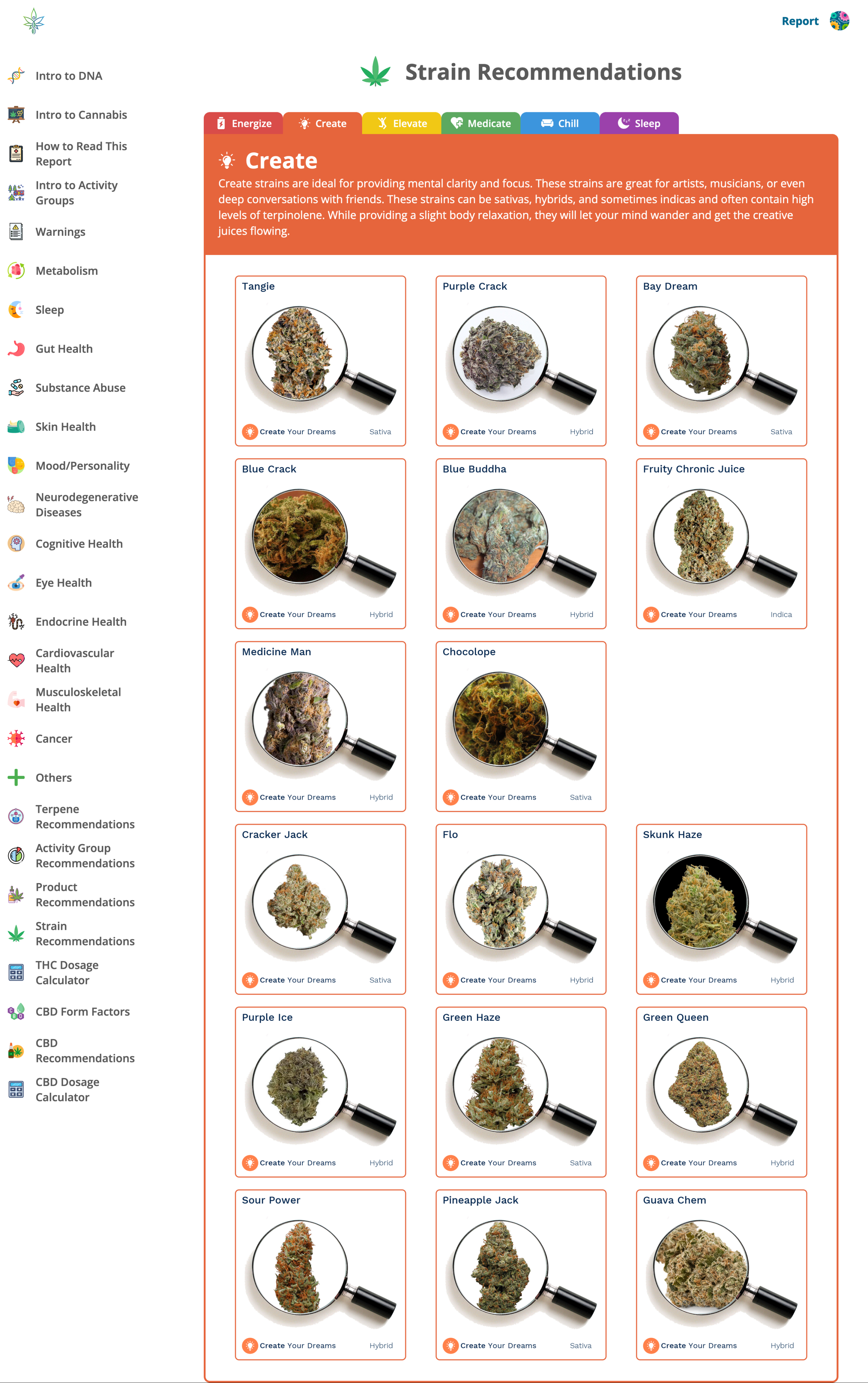 Uma parte muito interessante do teste de DNA que analisa o sistema endocanabinoide é a que traz recomendações diversas. O teste Strain Gene analisa o sistema endocanabinoide da pessoa e indica produtos e variedades canábicas dependendo dos objetivos.