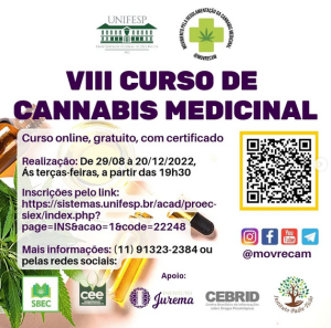Estão abertas, até o dia 29 de agosto, as inscrições para a oitava edição do Curso de Cannabis medicinal realizado pela Unifesp, MovReCam, CEBRID, Instituto Padre Ticão, SBEC e Instituto Jurema. Qualquer pessoa pode se inscrever pelo link, ou assistir as aulas pelo canal do YouTube do MovReCam.