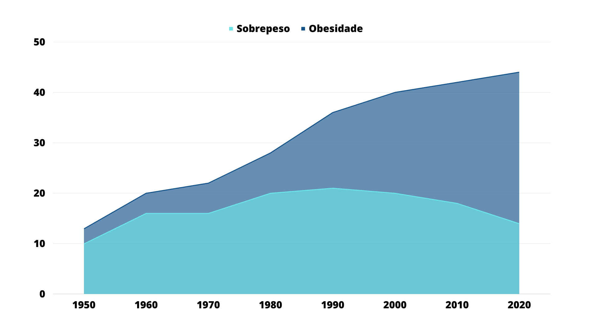 No gráfico abaixo, também produzido pela OMS, a tendência da obesidade IMC>30 (Índice de Massa Corpórea) aumenta mais que o sobrepeso IMC>25 e <30.As pessoas estão ficando mais obesas mais rapidamente. Este gráfico é alarmante, pois todas as doenças crônicas provenientes da obesidade estão mais presentes que no sobrepeso.