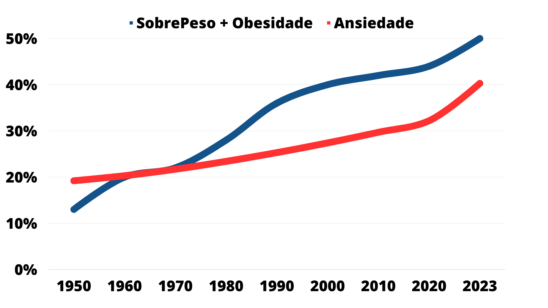 Em recente pesquisa das pesquisas (meta análise) fica claro a correlação entre Ansiedade e Obesidade (Transtorno Alimentar). (Ref. 1), no gráfico abaixo, da OMS e do National Institute of Mental Health (NIMH) desde 1950 até 2023 (pós pandemia) a correlação fica mais clara. As terapias atuais focam na restrição do apetite e em dietas específicas e não atacam a causa: ANSIEDADE!