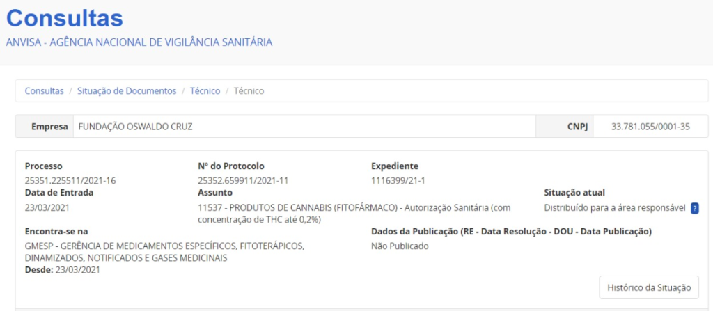 De acordo com o sistema de consultas da Anvisa, o pedido já foi distribuído para a área responsável, no caso a Gerência de Medicamentos Específicos, Fitoterápicos, Dinamizados, Notificados e Gases Medicinais (Gmesp). Este já é o décimo pedido para produção nacional de derivados da Cannabis que a Anvisa recebe.