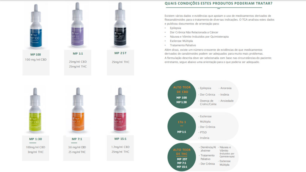 São seis produtos fitoterápicos de variadas concentrações de THC e canabidiol, o CBD. Os medicamentos são produzidos no Reino Unido seguindo as Boas práticas de Fabricação (BPF) europeias Classe D para produtos não estéreis. Isso enquadra canabinoides, incluindo o THC. Além disso, as instalações de produção da MGC Pharma contam com com certificação APPCC (Análise de Perigos e Pontos Críticos de Controle).