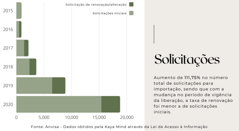As solicitações para importação de remédios à base de Cannabis feitas à Anvisa crescem de forma exponencial no Brasil, movidas por cada vez mais acesso à informação, pesquisas e o avanço político da pauta. Segundo projeções da Kaya Mind, startup brasileira de inteligência do mercado da Cannabis, 2021 terá um aumento de 151% das licenças iniciais (primeiro pedido de importação do paciente) solicitadas ao órgão, em comparação com o ano passado.