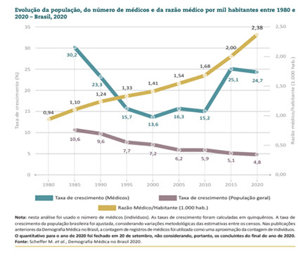 Nos últimos 100 anos, o aumento no número de médicos foi 5 vezes maior do que o de habitantes. Em 1920, ponto de referência do estudo, existiam 14.031 médicos no país. Um século depois, a quantidade é 35,5 vezes maior. No mesmo período, a população do país aumentou 6,8 vezes, passando de 30 milhões para 210 milhões de habitantes.