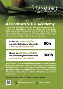 Para além dos cursos de capacitação, a Vigo Academy está em fase de constituição do corpo docente para lançar no segundo semestre desse ano uma Pós-Graduação em Cannabis para fins odontológicos. Na formação latu senso são 360 horas de aulas com a certificação do MEC.