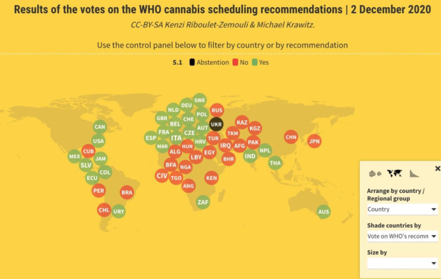A Comissão de Entorpecentes inclui 53 estados membros, entre eles o Brasil, que votou contra todas as recomendações da OMS. Porém o voto foi vencido pela maioria das nações numa votação apertada: 27×25 e uma abstenção. Os países votaram uma série de recomendações da OMS sobre a reclassificação da Cannabis e seus derivados. Mas a atenção ficou em torno da remoção da Cannabis do Anexo IV da Convenção Única sobre Entorpecentes de 1961 – onde estava até agora, ao lado de opióides perigosos e altamente viciantes como a heroína.
