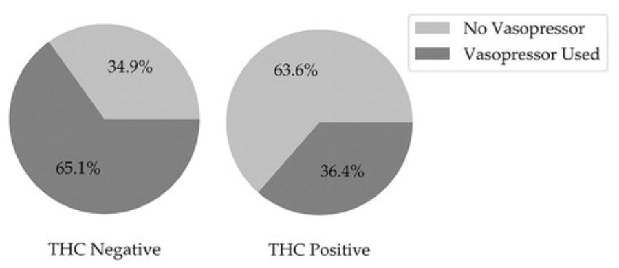 Essencialmente, um agente vasopressor é um remédio que faz a pressão sanguínea aumentar. Justamente o que o estudo observou foi que o grupo de pacientes com THC (tetrahidrocanabinol) positivo foi menos propenso a receber vasopressores intraoperatórios. Ou seja, pacientes expostos à Cannabis apresentaram uma pressão arterial mais estável durante anestesia geral.
