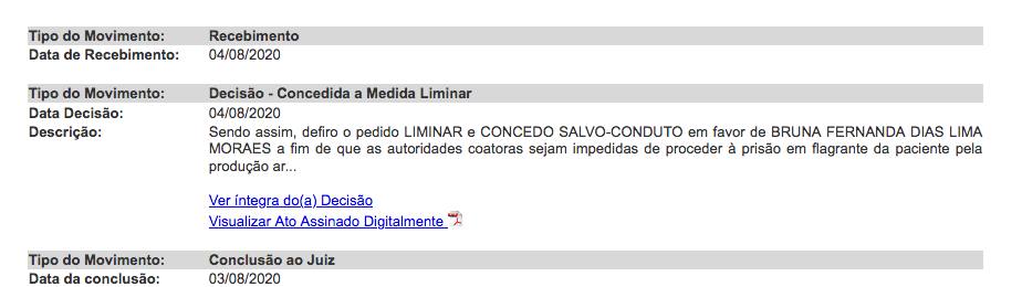 “Sendo assim, defiro o pedido liminar e concedo salvo-conduto em favor de Bruna Fernanda Dias Lima Moraes a fim de que as autoridades coatoras sejam impedidas de proceder à prisão em flagrante da paciente pela produção artesanal de 30 plantas da Cannabis sativa, para fins estritamente medicinais, bem como fiquem impedidas de apreenderem as mudas das plantas utilizadas para o tratamento dos filhos da paciente”, determinou o magistrado.