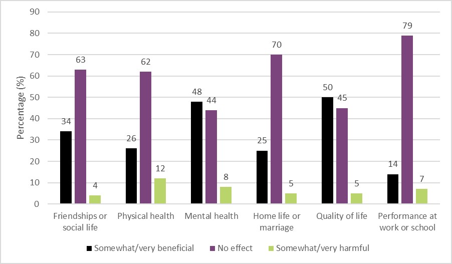 Na pesquisa de 2022, o órgão perguntou, por exemplo, os efeitos que o uso regular de Cannabis tinha na vida das pessoas. Os participantes responderam que a maconha é muito benéfica principalmente para qualidade de vida e saúde mental. Quanto a performance no trabalho ou nos estudos e na vida familiar, os canadenses não perceberam tanto impacto.